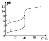 D.当I曲线和II曲线pH均为7时,一溶液中的c(Cl-)等于另一溶液中的c(CH3COO-)