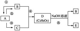 4、填空题  (10分)已知A是乙烯,B、C、D、E均为常见的有机物,在一定条件下,它们有如下图所示的转化关系。