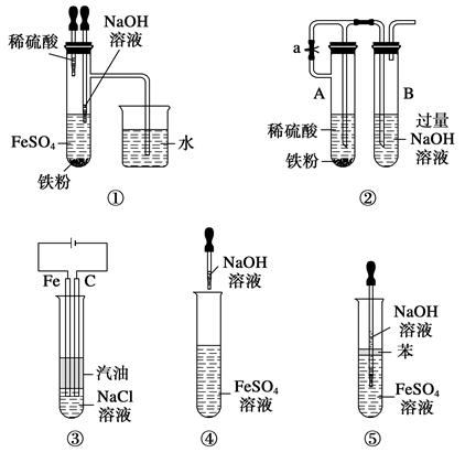 本题解析:因为Fe(OH)2在空气中很容易被氧化为红褐色的Fe(OH)3,即发生4Fe(OH)2+O2+2H2O=4Fe(OH)3。因此要较长时间看到Fe(OH)2白色沉淀,就要排除装置中的氧气或空气。①、②原理一样,都是先用氢气将装置中的空气排尽,并使生成的Fe(OH)2处在氢气的保护中;③的原理为铁作阳极产生Fe2+,与电解水产生的OH-结合生成Fe(OH)2,且液面用汽油保护,能防止空气进入;⑤中液面加苯阻止了空气进入;④由于空气中的氧气,能迅速将Fe(OH)2氧化,因而不能较长时间看到白色沉淀。