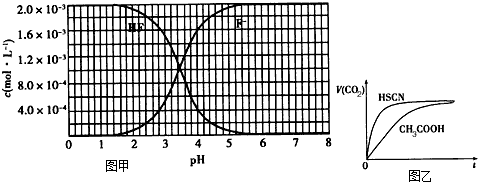 (1)25℃时,将20mL0.10mol/LCH3COOH溶液和20mL0.10mol/LHSCN溶液分别与20mL0.10mol/LNaHCO3溶液混合,实验测得产生的气体体积(V)随时间(t)变化的示意图为图2所示:①反应初始阶段,两种溶液产生CO2气体的速率存在明显差异的原因是______,②反应结束后所得两溶液中,c(CH3COO-)______c(SCN-)(填“>”、“<”或“=”)