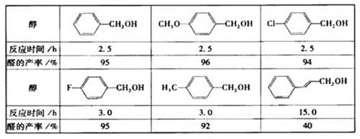 4、填空题 醇在催化作用下氧化成醛的反应是绿色化学的研究内容之一。某科研小组研究了钯催化剂在氧气气氛中对一系列醇氧化成醛反应的催化效果,反应条件为:K2CO3、363K、甲苯(溶剂)。实验结果如下: