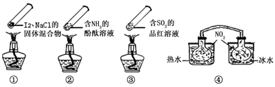 本题解析:A、上部聚集碘是因为碘易升华,物理性质,不是热稳定性,故A错误;B、②中为红色溶液,加热氨气逸出,溶液变无色,③中二氧化硫使品红溶液褪色,溶液为无色,加热,无色化合物分解,二氧化硫逸出,溶液变红色,故B错误;C、热水中温度升高,平衡向左移动,二氧化氮的浓度增大,颜色加深,浸泡在冷水中,温度降低,平衡向右移动,二氧化氮的浓度减小,颜色变浅,故C正确;D、①中发生的是物理变化,故没有可逆反应发生,D错误。故选C。