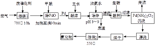 5、填空题 (12分)美日科学家因研发“有机合成中的钯催化的交叉偶联”而获得2010年度诺贝尔化学奖。有机合成常用的钯/活性炭催化剂长期使用,催化剂会被杂质(如:铁、有机物等)污染而失去活性,成为废催化剂,故需对其回收再利用。一种由废催化剂制取氯化钯(PdCl2)的工艺流程如下: