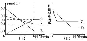 3、选择题 T ℃时,A气体与B气体反应生成C气体。反应过程中A、B、C浓度变化如图(Ⅰ)所示,若保持其他条件不变,温度分别为T1和T2时,B的体积分数与时间的关系如图(Ⅱ)所示,则下列结论正确的是( )
