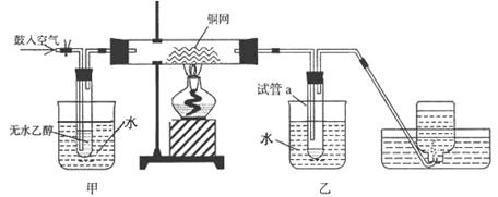说明该乙醇催化反应是放热反应,才能使反应的温度持续在高温的条件下。甲中主要是放热水,使乙醇蒸发出来,乙主要是放冰水,主要是冷却乙醛 。在a中能收集到乙醛外还可以收集到容易挥发的乙醇。此外,在集气瓶中还能收集到不参与反应的氮气。酸能使紫色石蕊试纸变红,说明该溶液呈酸性。因此a试管中还会含有乙酸。除掉乙酸可以选用呈碱性的碳酸氢钠溶液与乙酸反应,生成乙酸钠,然后在通过蒸馏的方法就可以除去乙酸