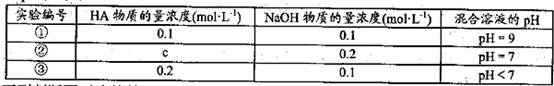 本题解析:A、由①一元酸与一元强碱等体积混合,溶液呈碱性,说明该酸为弱酸,所以HA的电离方程式正确;B、不考虑其他组的实验结果,与氢氧化钠等体积混合溶液呈中性时,说明若酸为强酸则c=0.2,若酸为 弱酸则酸过量,c>0.2,所以c≥0.2,正确;C、③组中,溶液呈酸性,所得溶液为NaA和HA的混合液,酸的电离大于酸根离子的水解程度,所以离子浓度的大小关系是