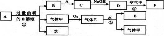 1、填空题 现有常见金属单质A和气体甲、乙及物质B、C、D、E、F,它们之间能发生如下反应,已知B加入硫氰化钾溶液显血红色,气体乙显红棕色,(图中有些反应的产物和反应的条件没有全部标出)。