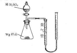 3、实验题 [2012·云南省质检](10分)用如图所示装置测定Fe和Fe2O3的混合物中单质铁的质量分数(夹持部分已略去)。称取Wg样品置于锥形瓶中,通过分液漏斗加入足量稀硫酸使样品完全溶解。实验前量气管起始读数为amL,实验后量气管的最终读数为bmL。