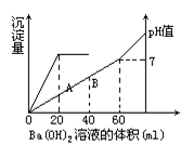 5、计算题 硫酸和盐酸的混合溶液20mL,在这溶液中加入0.025 mol/L氢氧化钡溶液时生成硫酸钡的量和溶液的pH值如图所示。