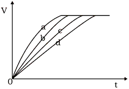 5、选择题 等质量的铁与过量的盐酸在不同的实验条件下进行反应,测定在不同时间t产生氢气体积v的数据,根据数据绘制得到下图,则曲线a所对应的实验组别是
