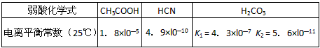 D.等物质的量浓度的各溶液pH关系为:pH(NaHCO3)>pH(NaCN)>pH(CH3COONa)