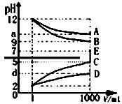 5、选择题 物质A~E都是由下表中离子组成的, www.91exAm.org常温下各物质从1mL稀释到1000mL,pH的变化关系有如图所示,其中A与D反应得到E。