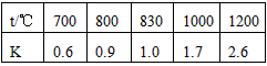 CO(g)+H2O(g)其化学平衡常数K与温度t的关系如下表