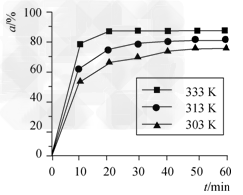 B(OCH3)3?+3H2O中,H3BO3的转化率(α)在不同温度下随反应时间(t)的变化见下图,