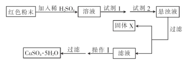 (4)经过实验分析.确定红色粉末为Fe2O3和Cu2O的混合物。实验小组欲利用该红色粉末制取较纯净的胆矾(CuSO4·5H2O)。经过查阅资料得知.在溶液中通过调节溶液的酸碱性而使Cu2+、Fe2+、Fe3+分别生成沉淀的pH如下: