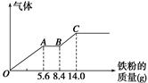 本题解析:若铁粉过量,则生成气体的体积之比为1:2,充分反应后生成气体体积比为2∶3,可知铁粉对盐酸过量,对硫酸不足,铁与盐酸反应生成氢气为0.3mol,则与硫酸反应生成氢气0.45mol,参加反应的铁粉的物质的量为0.45mol,质量为0.45mol×56g/mol="25.2g" ,答案选B。