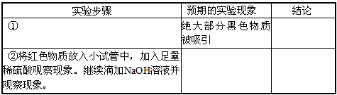 3、实验题 现在许多食品都采用密封包装,但包装袋中的空气、水蒸气仍会使食品氧化、受潮变质,因此一些食品包装袋中需放入一些脱氧剂,以使食品保质期更长一些。甲、乙、丙三同学为了探究“脱氧剂”的成分,从某食品厂的月饼包装袋中取出“脱氧剂”一袋,打开封口,将其倒在滤纸上,仔细观察,脱氧剂为灰黑色粉末,还有少量的红色粉末。