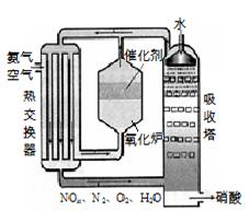 5、填空题 右图为工业制备硝酸的设备示意图,其生产过程中发生的反应主要有: