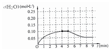 在第5分钟时将体系的温发升高到T2,若在第8分钟时达到新的平衡,在反应是吸热反应升温平衡正向进行,水的浓度减小,如图中画出第5分钟到9分钟后c(H2O)浓度变化趋势的曲线为