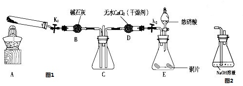 £¨5£©Ì½¾¿NO2ÄÜ·ñÓëNa2O2·¢ÉúÑõ»¯»¹Ô·´Ó¦£®ÎªÁËÑéÖ¤NO2Äܱ»Na2O2Ñõ»¯£¬¸ÃС×éͬѧѡÓÃB¡¢D¡¢E×°Ö㬽«BÖеÄÒ©Æ·¸ü»»ÎªNa2O2£¬ÁíÑ¡F×°Öã¨Èçͼ2Ëùʾ£©£¬ÖØÐÂ×é×°£¬½øÐÐʵÑ飮װÖõĺÏÀíÁ¬½Ó˳ÐòÊÇ ??