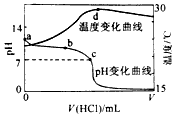 3、选择题 室温下,将1.000mol盐酸滴入20.00mL 1.000mol氨水中,溶液pH和温度随加入盐酸体积变化曲线如下图所示。下列有关说法正确的是