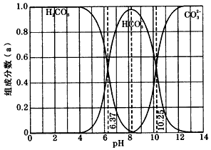 5、选择题 下图是一水溶液在pH从0至14的范围内H2CO3、HCO3-、CO32-三种成分平衡时组成分数,下列叙述正确的是
