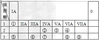 5、填空题 下表为元素周期表的一部分,请参照元素①~⑨在表中的位置,用化学用语回答下列问题