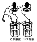 (1)该小组同学首先用密度为1.049 g·cm-3的乙酸(CH3COOH)和质量分数为36.5%,密度为1.18 g·cm-3的浓盐酸分别配制1 mol/L CH3COOH溶液和1 mol/L HCl溶液各500 mL,则他们应该量取乙酸和浓盐酸的体积分别为?和?;