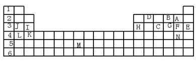 (1)根据元素在周期表中的位置可判断E是稀有气体元素Ar,化学性质最不活泼。金属性最强的元素位于第IA的L,L是K。非金属性最强的是位于第ⅦA的A,即F。温下单质为液态的非金属元素是Br,即是N。周期表中第3列至第12列共10列元素属于过渡元素,所以属于过渡元素的是M。