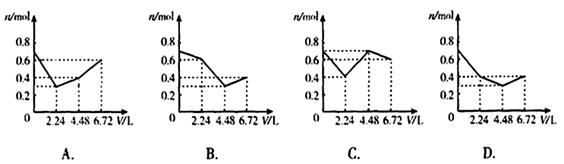 3、选择题 往含0.2molKOH和0.1molCa(OH)2的溶液中持续地通入CO2气体,当通入气体的体积为6.72L(标准状况)时立即停止,则在这一过程中,溶液中离子的物质的量n和通入CO2的体积V的关系示意图正确的是(气体的溶解和离子的水解忽略)?