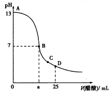 3、选择题 25℃时,在25 mL0.1 mol·L-1的NaOH溶液中,逐滴加入0.2 mol·L-1的CH3COOH溶液,溶液的pH与醋酸体积关系如图,下列分析正确的是