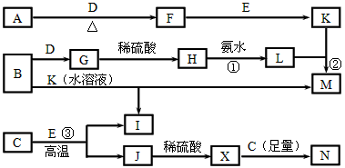 2、推断题 下列物质A~N均为中学化学中常见物质,其A、B、C是三种常见金属,F、G、J、E均为氧化物, F是淡黄色固体,其焰色反应为黄色,E在常温下是无色液体, D、I都是无色气体,L为白色胶状沉淀。在适当的条件下,它们之间可以发生如下图所示的转化(部分产物被略去)。