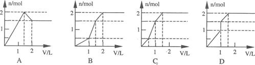 5、选择题 向含lmolHCl和lmolMgSO4的混合溶液中加入lmol·L-1Ba(OH)2溶液,产生沉淀的物质的量(n)与加入Ba(OH)2溶液体积(V)间的关系图正确的是