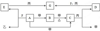 4、填空题 A、B、C、D、E、F、G为常见物质,其中C为淡黄色固体.甲、乙、丙为常见气体.各物质的转化关系如图所示.