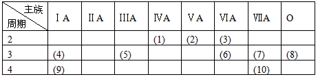 4、填空题 下表是元素周期表的一部分,针对表中的(1)~(10)中元素,用元素符号、名称或化学式填空
