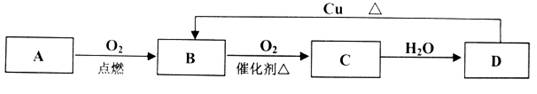 3、填空题 (8分)A、B、C、D四种物质之间有下图所示的转化关系。已知:A是一种非金属单质,为黄色晶体;B、C、D均为化合物;B是形成酸雨的主要成分之一。