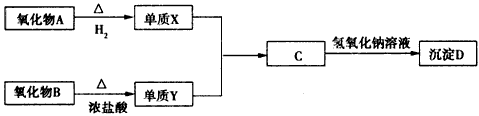 其中氧化物A是红色粉末,B是黑色粉末,单质X在Y中燃烧有棕黄色烟生成,棕黄色烟溶于水,溶液呈黄绿色。