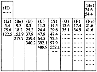 2、填空题 下表是元素周期表中第一、第二周期10种元素的某种性质的一组数据(所列数据的单位是相同的)。除“……”的五种元素外,其余元素都给出了该种元素的全部该类数据。研究这些数据,回答下列问题