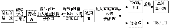 (2)高纯氧化铁可作现代电子工业材料。以下是用硫铁矿烧渣(主要成分为Fe2O3、Fe3O4、? FeO、SiO2)为原料制备高纯氧化铁(软磁α- Fe2O3)的生产流程示意图: