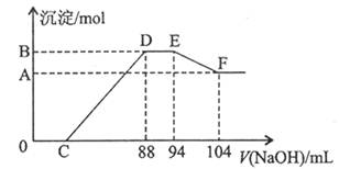 (3)将一定量铝粉和铁粉的混合物与上述反的稀硝酸充分反应,反应过程中无气体放出(氧化物产生)。在反应结束后的溶液中,滴加5mol/L的NaOH溶液,所加NaOH溶液(mL)与产生的沉淀的物质的量关系如图所示则: