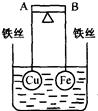 4、选择题 如右图所示,杠杆AB两端分别挂有体积相同.质量相等的空心铜球和空心铁球,调节杠杆并使其在水中保持平衡,然后小心地向烧杯中央滴入浓CuSO4溶液,一段时间后,下列有关杠杆的偏向判断正确的是(实验过程中,不考虑铁丝反应及两球的浮力变化)(? )
