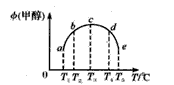 温度分别为T1~T5的密闭容器中,反应均进行到5min时甲醇的体积分数下列有关说法正确的是