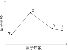 1、填空题 W、X、Y、Z是四种常见的短周期元素,其原子半径随原子序数变化如下图所示。已知W的一种核素的质量数为14,中子数为7;X的离子与NH4+具有相同的质子、电子数目; W与Y的氧化物均能导致酸雨的形成;Z的非金属性在同周期主族元素中最强。