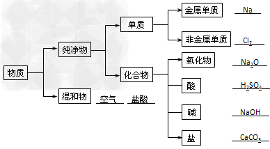 5、填空题 根据物质的组成和性质特点,运用树状分类法对下列物质进行分类:钠(Na)、氯气(Cl2)、盐酸、硫酸(H2SO4)、碳酸钙(CaCO3)、氧化钠(Na2O)、氢氧化钠(NaOH)、空气