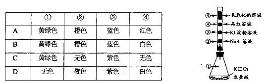 3、选择题 已知常温下氯酸钾与浓盐酸反应能放出氯气,现按右下图进行氯气的性质实验。玻璃管内分别装有滴有少量不同溶液的白色棉球,反应—段时间后,对图中指定部位颜色描述正确的是