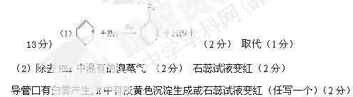 1、填空题 (13分)下图为苯和溴取代反应的改进实验装置。其中A为带支管的试管改制成的反应容器,在其下端开了一个小孔,塞好石棉绒,再加入少量铁屑。?