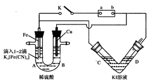 (1)开始时,接通K电键:U形管中无沉淀,却观察到B端____;根据以上实验可知电源正极为____(填“a”或“b”)。Fe电极上发生的电极反应为___,V形管中现象是___ 。