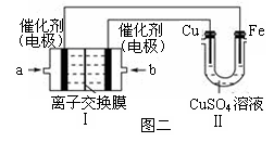 ②图二中,Ⅰ是氢气燃料电池(电解质溶液为KOH溶液)的结构示意图,电池总反应为:2H2+O2=2H2O。该同学想在Ⅱ中实现铁上镀铜,则a处加入的是________(填“H2”或“O2”),b处电极上发生的电极反应式是_____________________。