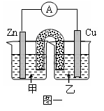 ①图一是根据反应Zn+CuSO4 Cu+ZnSO4设计成的锌铜原电池。甲池中的电解质溶液为 (填化学式)______________,Cu极的电极反应式是__________________,盐桥中是含有琼胶的KCl饱和溶液,电 池工作时Cl-向________(填“甲”或“乙”)池移动。