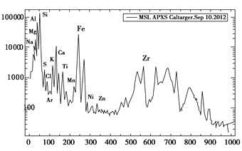 2、选择题 北京时间2012年9月14日,国外媒体报道,美国宇航局的“好奇”号火星车已经展开它的X射线分析器,并首次完成对火星物质元素成分的分析。下面这张图显示的是α粒子与X射线分光仪从某仪器获得的元素分析数据。多个峰值表明各种成分非常丰富,其中包括在火星大气里发现的氩,该仪器自身的铝,以及火星土壤微粒所含的硫黄和氯.